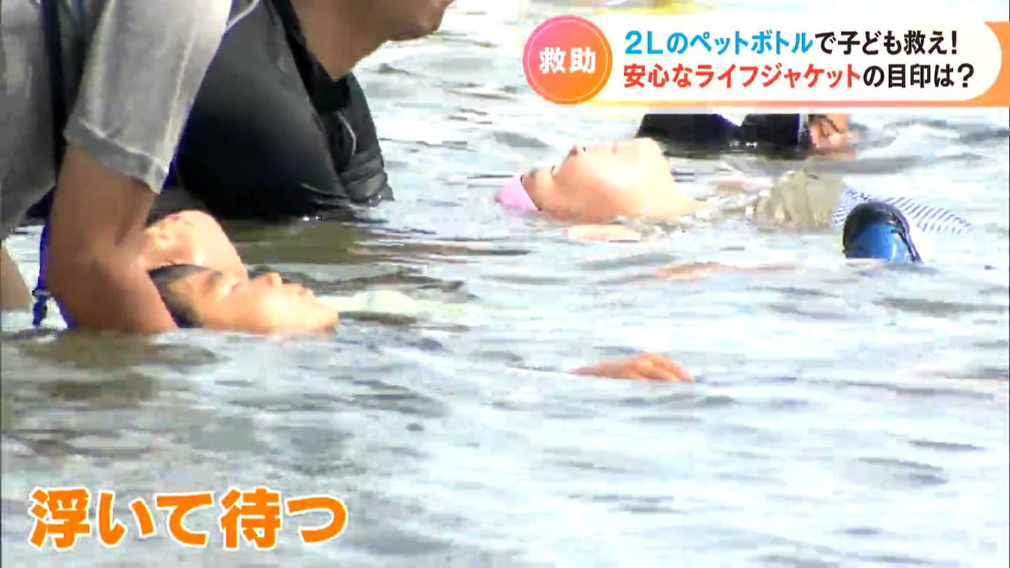 ①溺れた人を救助する際に役に立つのがペットボトルです。ペットボトルを服の中に入れると体が浮き、泳ぎやすくなります。