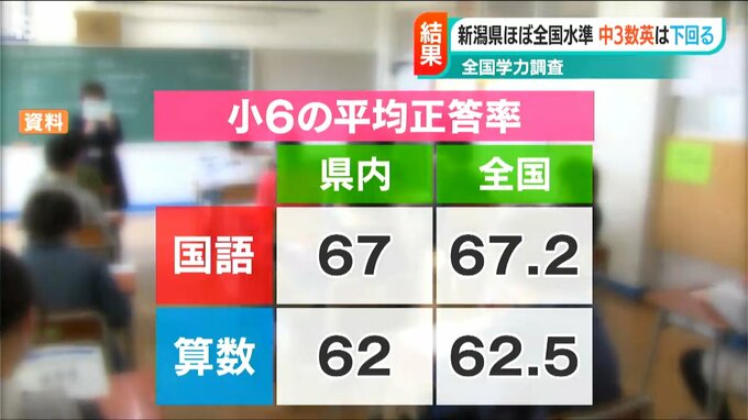 新潟県内の平均正答率を全国と比べてみると、小学生の国語は67%、算数は62%で、ともに全国平均並みでした。