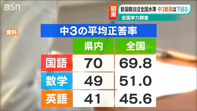 31日に公表された結果によりますと、新潟県内の平均正答率は、中学校の国語と小学校が全国平均並みだった一方、中学校の数学と英語は全国平均を下回りました。