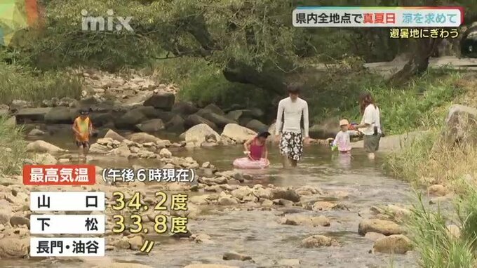 下関地方気象台によりますと、きょうの県内は山口で34.2度、長門市油谷で33.8度、下松で33.8度などとなっていて、県内すべての地点で30度を超える真夏日となりました。
