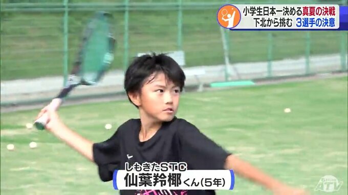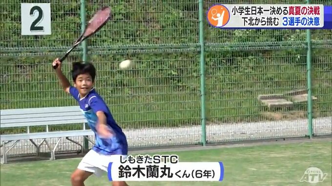 真夏の日差しが照り付けるコートで練習に打ち込む「しもきたSTC」の選手たち。小学6年生の鈴木蘭丸くんと廣崎 樹くん、そして5年生の仙葉羚椰くんの3人は全国大会に向けて最後の調整を重ねています。鈴木くんはことし6月の県予選で八戸市の選手とペアを組んで初優勝。廣崎くんと仙葉くんは3位に入り、全国大会への挑戦権を得ました。