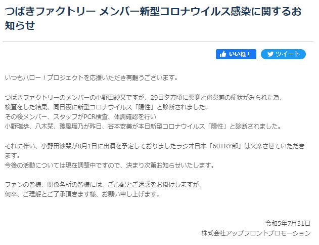 つばきファクトリー メンバー新型コロナウイルス感染に関するお知らせ