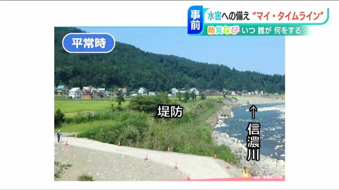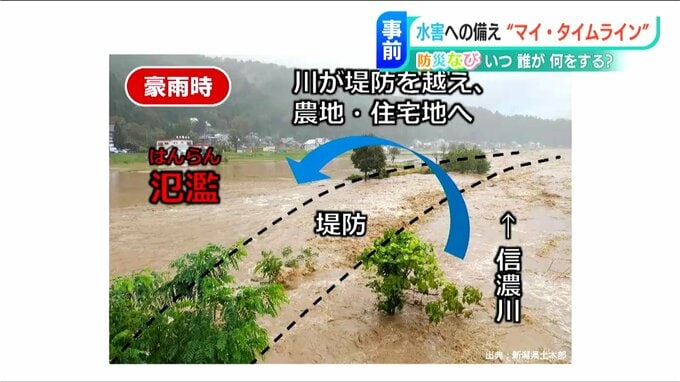 津南町を流れる信濃川の様子を見てみると、川の横には堤防がありますが、2019年に台風19号が新潟県内を襲った際、川の水が堤防を超え、農地や住宅街が浸水しました。