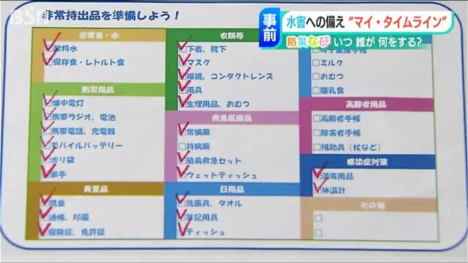 土砂災害と水害で避難すべき場所が変わることもあるので、2~3か所は決めておくといいでしょう。また、非常時にどんなものを持っていくか事前に考えておくことも大事です。「マイ・タイムライン」には持ち出し品のリストもあるのでチェックしながら準備するのがおすすめです。