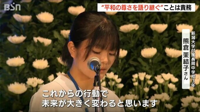 【新潟大学附属長岡中学校3年 熊倉茉結子さん】「私たちの世代は戦争経験者から直接話を聞くことができる最後の世代だと思います。もう二度と戦ってはいけないことを後世にどう伝えるのか、私たちのこれからの行動で未来が大きく変わると思います」