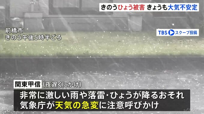 きのう夕方、北関東でひょうが降り、群馬県では3人がけがをしました。きょうも関東などでは大気の状態が非常に不安定となる見込みで注意が必要です。群馬県などによりますと、きのう県内で3人が頭や顔に軽いけがを…