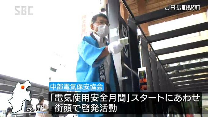 街頭活動は8月が「電気使用安全月間」になっているのに合わせ、中部電気保安協会が各地で行うもので、JR長野駅前では職員11人が除菌シートを配り、電気の安全な利用を呼びかけていました。