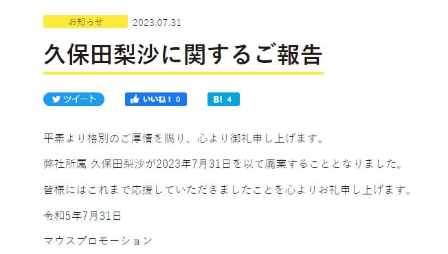 また、所属事務所の公式サイトにも、久保田梨沙さんの声優業の廃業について報告がアップされています。