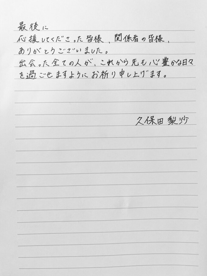 久保田さんは「皆様と過ごした時間、出会ったキャラクターは私の一生の宝物です。その宝物を抱えて次に進みたいと思います。最後に応援してくださった皆様、関係者の皆様、ありがとうございました。出会った全ての人が、これから先も心豊かな日々を過ごせますようにお祈り申し上げます。」と、ファンへの思いを綴っています。