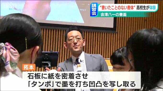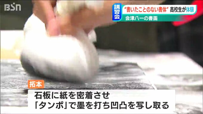 7月30日に開かれた講習会には、新潟市内の8つの高校の書道部員およそ50人が参加し、拓本には世界的に知られる奈良の職人が手がけた石板が初めて使われました。