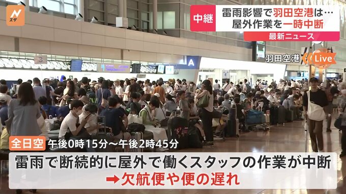 雷雨の影響は空の便にも出ています。現在、羽田空港第二ターミナルの保安検査場前に来ています。羽田空港の出発ロビーでは、保安検査場に入るために並ぶ長い列やソファーで座って待つ人が多く見られます。家族で山…