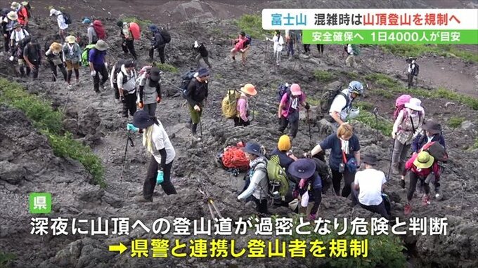 登山者の増加による事故が懸念されている富士山について山梨県は山頂付近が混雑した場合、登山者の規制を行う方針を明らかにしました。
