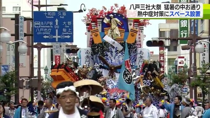 7月31日夜に開幕した青森県南地方最大の夏祭り八戸三社大祭。1日行われた神輿と山車が中心街を練り歩く「お通り」など5日間に渡って熱気に包まれる祭りでは熱中症対策にも力が注がれています。八戸三社大祭の「お…