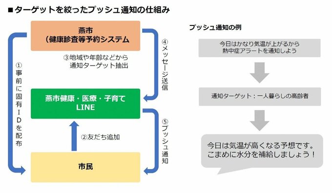 今回のLINEはBSNアイネットが開発した、燕市の健診の予約システムと連携しています。この予約システムの利用者が今回のLINEに登録した場合、燕市は利用者の地域や年齢などから、「健診を受けていない人」や「一人暮らしの高齢者」のように、ターゲットを絞って最新情報をプッシュ通知できるようになります。こうした取り組みは県内初だとういうことです。