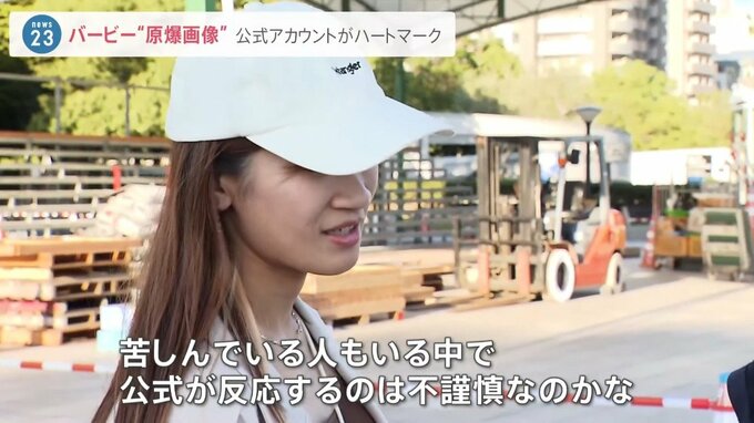 私たち日本人は見過ごせない画像ですが、さらに問題なのがバービーの公式アカウントが返信をしているところです。「忘れられない夏になりそうですね」とハートマークをつけて投稿。また、キノコ雲の画像にもウインクのマークをつけて返信しています。公式が好意的に受け止めているかのような返信に見えます。