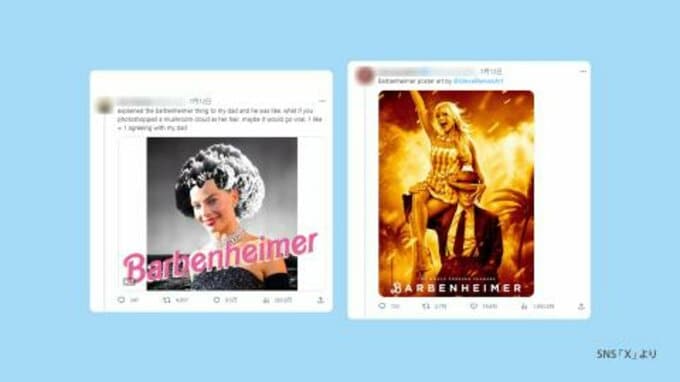 その画像というのは、バービー役の俳優の髪型に原爆を連想させる“キノコ雲”が合成されています。さらに、爆発を背景に『バービー』、『オッペンハイマー』の2作品の登場人物が合成された画像もあります。