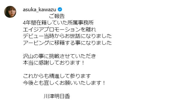 俳優の川津明日香さん(23)が自身のインスタグラムを更新し、所属事務所を移籍したと明らかにしました。