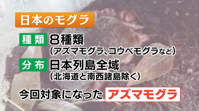 日本国内には8種類のモグラがいて、北海道と南西諸島を除く日本列島のほぼ全域に分布しています。このうち、今回対象となったのは「アズマモグラ」で、2年前に捕まえたときには、すでに妊娠していました。