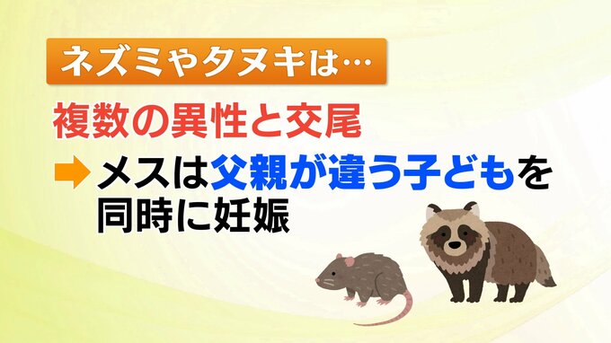 実は、ネズミやタヌキなどは、繁殖期に複数の異性と交尾するので、父親が違う子どもを同時に妊娠することもよくあるそうなんです。