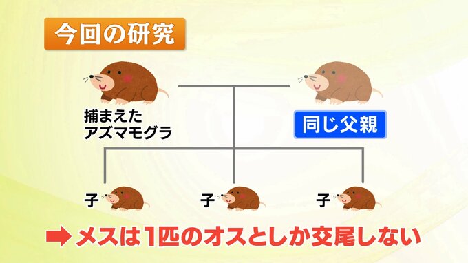 そこで、モグラはどうなんだ?というと、今回捕まえたモグラの子ども3匹のDNAを解析したところ、父親が同じだったことがわかりました。ということは、アズマモグラのメスは1匹のオスとしか交尾しない可能性が高いということです。