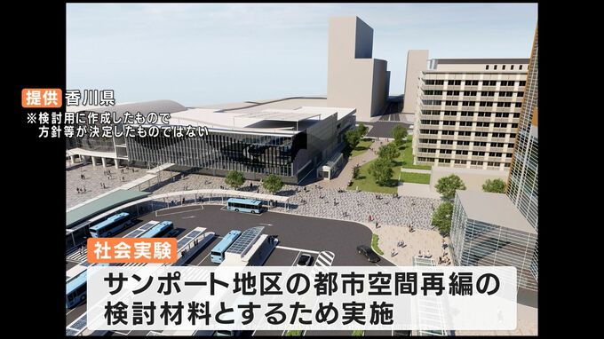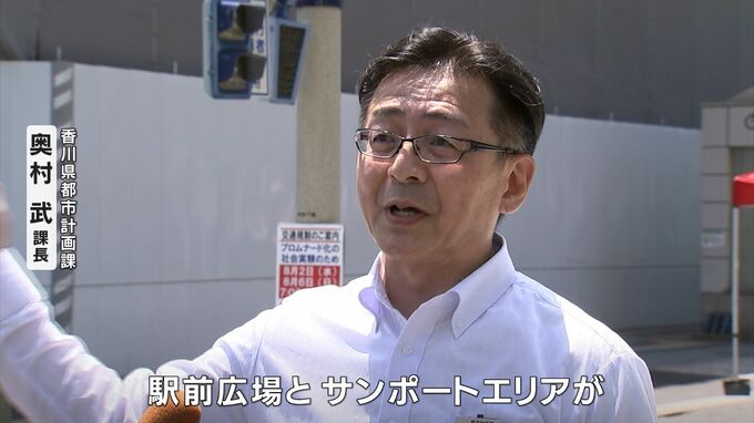 社会実験は香川県立アリーナなどの整備が進む、サンポート地区の都市空間再編の検討材料にと行われるものです。高松駅の北側の車道は、常時遊歩道化が検討されています。