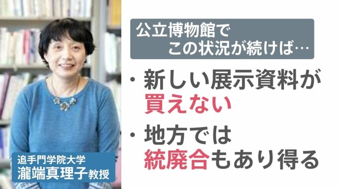 想像していなかったですよね。博物館に詳しい追手門学院大学の瀧端真理子教授によると、「公立博物館でこの状況が続けば、▼新しい展示資料が買えない。▼地方では博物館の統廃合もあり得る」ということなんですね。