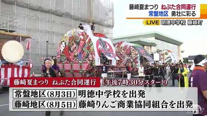 続々とねぷたが集まってきて、祭りムードが高まっている青森県藤崎町の明徳中学校です。3日の藤崎町常盤地区での運行には9つの団体が出陣、準備は万端です。それでは、お囃子を披露してもらいます。よろしくお願い…