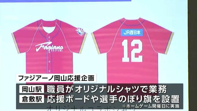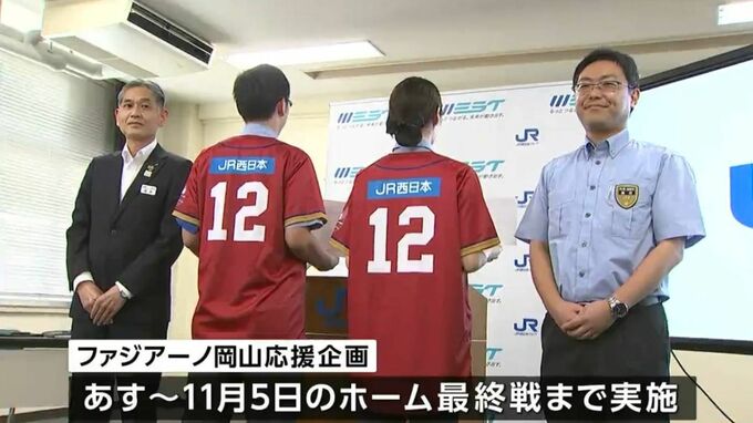 7月の定例会見で発表されたもので、JR西日本岡山支社では、サッカーJ2・ファジアーノ岡山を応援するため、ホームゲームに合わせて岡山駅の職員がオリジナルシャツを着て業務にあたるほか、倉敷駅では応援ボードや選手の「のぼり旗」などを設置するということです。