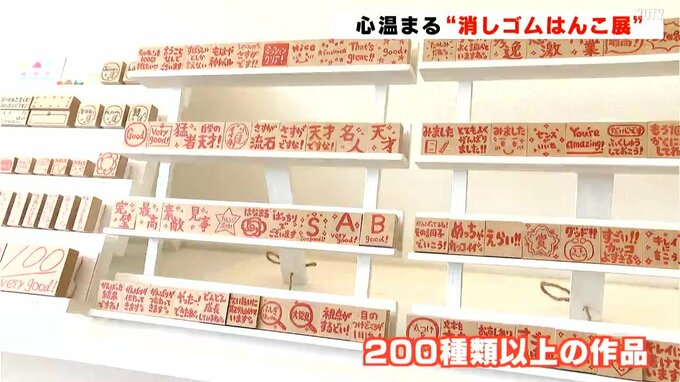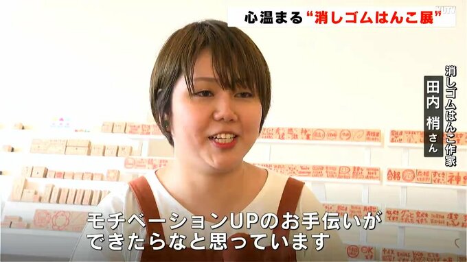 高知市出身で消しゴムはんこ作家の田内梢(たのうち・こずえ)さんが大勢の人たちに消しゴムはんこの魅力を知ってもらおうと企画しました。会場には手作りした200種類以上の作品がずらりと並んでいて、一つ一つの作品には田内さんが心を込めて考えた温かいメッセージが彫られています。
