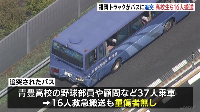 記者「バスの後方に衝突された痕がみられます」きょう午前7時前、福岡県行橋市の東九州道上りで大型トラックがバスに追突しました。追突されたバスには、福岡県豊前市にある青豊高校の野球部員や顧問などあわせて3…