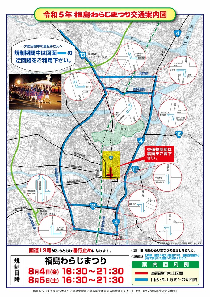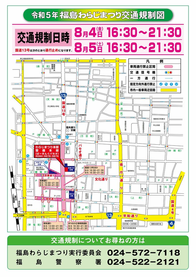 【交通規制】8月4日(金)、5日(土)福島市内中心部「福島わらじまつり」のため テレビユー福島 2023年8月4日(金) 14:04 国内 福島市では、8月4日(金)、5日(土)の「福島わらじまつり」開催に伴い、市内中心部の国道13号などで交通規制が行われます。 交通規制の場所や時間は画像の通りです。ご確認のうえ、お出かけください。