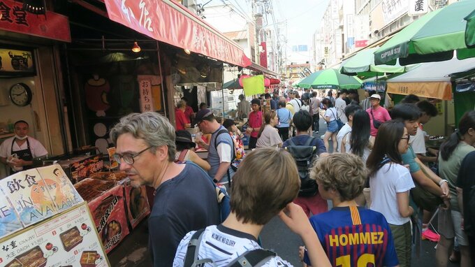 現在の築地場外は外国語だらけです。見た目に目立つ欧米の人々だけでなく、中国や韓国、東南アジアやインドなどからの観光客でごった返し、日本語がほとんど聞こえません。