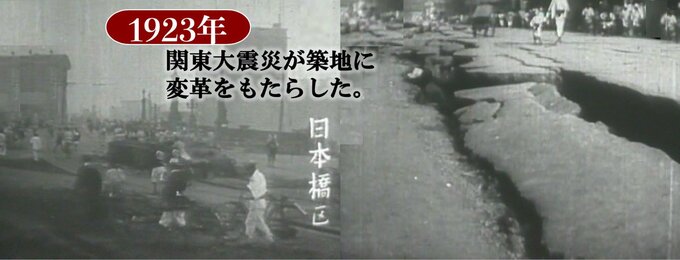 築地の姿が大きく変わったのが1923年の関東大震災でした。東京は焼け野原と化し、築地も洋風の家々がすべて焼失してしまいました。そこに日本橋から魚河岸が移転してきたのです。そこから築地は魚河岸の町として大きく発展していきます。