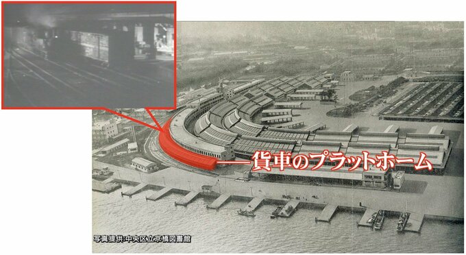 築地を俯瞰してみると、扇形になっていることが分かります。これは、当時、全国から運ばれる魚の運搬手段が貨物鉄道だったことによります。築地は貨物の路線に対応するために扇状にカーブする線路を引き込んだのです。