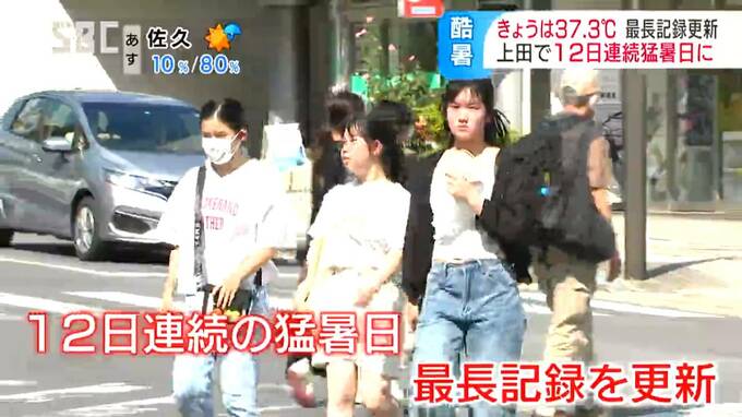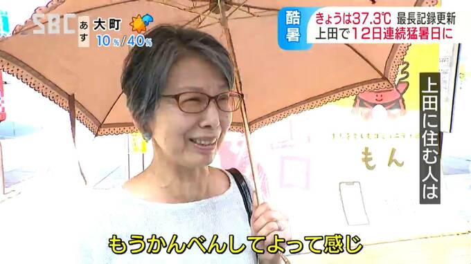 上田市に住む人は: 「もう勘弁してよって感じ」 「夏は暑くちゃねって私は言ったんですけど、主人は限度があると言っていました」 千曲市から遊びに来た人: 「異常ですね、暑すぎます」