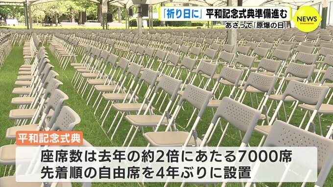 ことしの平和記念式典は、コロナ禍前と同じ規模で開催されます。去年よりもイス同士の間隔がせばまり、会場の座席数はおよそ2倍にあたる7000席です。先着順に座れる自由席も4年ぶりに設けられます。