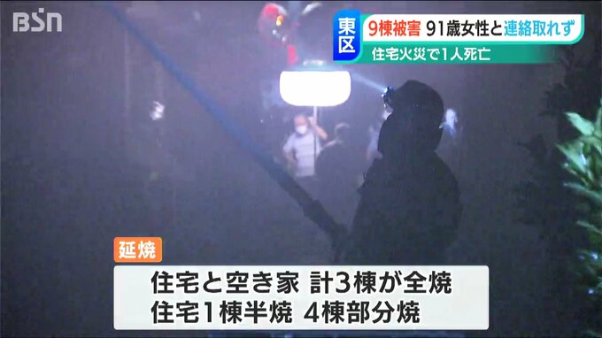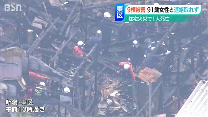 3日夜、新潟市東区で住宅など9棟が焼ける火事があり、焼け跡から1人の遺体が見つかりました。火元の家に住む91歳の女性と連絡が取れなくなっていて、警察などで確認を急いでいます。