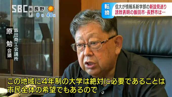 飯田商工会議所・原勉会頭: 「残念ではある、残念ではあるけれどもこの地域に4年制の大学は絶対に必要であるということは市民全体の希望でもあるので、地元の人含めてアピールしていく必要がある商工会議所としてはそれに全力を傾けたい」