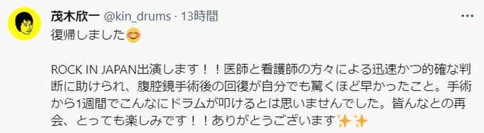 茂木さんは「復帰しました ROCK IN JAPAN出演します!!」と書き出し、「医師と看護師の方々による迅速かつ的確な判断に助けられ、腹腔鏡手術後の回復が自分でも驚くほど早かったこと」と、感謝と驚きを隠すことなく綴っています。