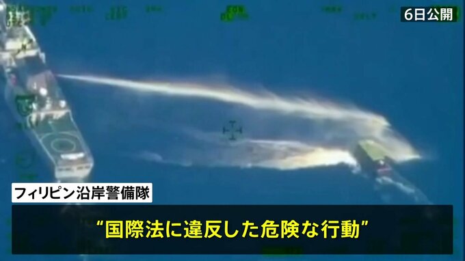 フィリピン沿岸警備隊は6日、南シナ海を航行中の沿岸警備隊の船に対し、中国海警局の船が「違法な放水を行なった」として強く非難しました。画面右側の船に対し、勢いよく放水を行う巨大な艦船。この映像は、フィ…