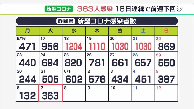6月7日、静岡県内の新型コロナウイルスの新規感染者は363人でした。16日連続で前の週を下回っています。感染者を自治体別にみますと、静岡市で135人、浜松市で91人、富士市で26人、富士宮市で14人などとなっていま…