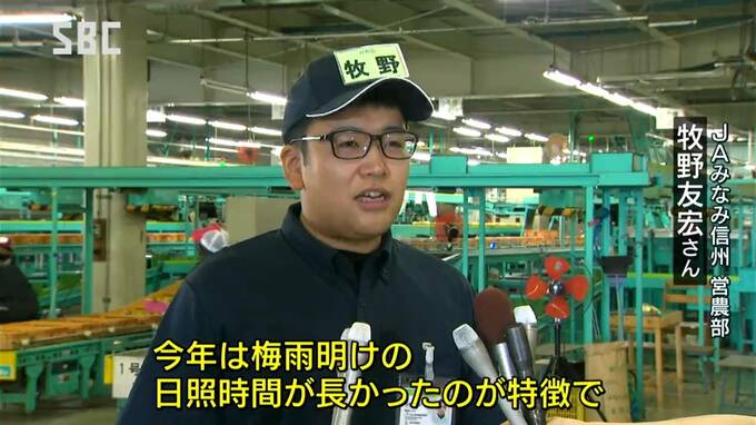 JAみなみ信州営農部 牧野友宏(まきの・ともひろ)さん: 「今年は梅雨明けの日照時間が長かったのが特徴で、非常に糖度が高い、大変甘いというのが今年の特徴」