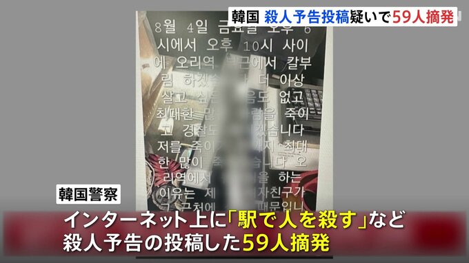 刃物を使った事件が相次ぐ韓国で、インターネット上に殺人を予告する投稿をしたとして、59人が摘発されました。韓国では先月、ソウル市内で男が刃物を持って暴れ、4人が死傷する事件が発生。今月もソウル郊外で男…