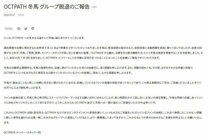 適応障害の治療に専念するため昨年 4 ⽉ 21 ⽇より休養をさせていただいておりました冬⾺は、担当医師の指⽰のもと、症状回復と活動再開を⽬指し戦ってまいりましたが、症状の回復がなされず、冬⾺、ご家族、医師、メンバー、スタッフが話し合いを重ねた結果、 「OCTPATH から離れ、治療を引き続き継続する」という冬⾺の選択を尊重することを決定致しました。そして、本⽇ 8 ⽉ 7 ⽇(⽉)を持ちまして、OCTPATH メンバーとしての活動に区切りをつけることになったことを皆様にご報告させていただきます。