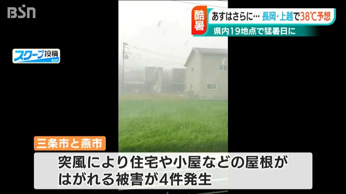 また、県によりますと三条市や燕市では突風により、住宅や小屋などの屋根がはがれる被害が4件発生しました。