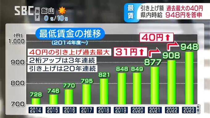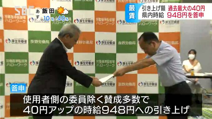 長野県の最低賃金審議会は、7日、現在908円の時給を40円引き上げ、948円とするよう答申しました。