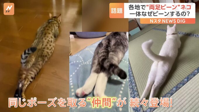 今SNSで話題となっている、足をピーンと伸ばして寝そべっているネコの映像。一体なぜこのポーズをとるのか。