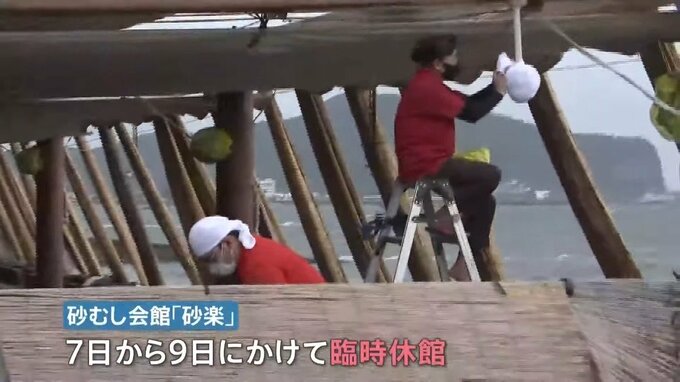 砂むし会館「砂楽」では、7日から9日にかけて臨時休館とし、台風に備え、片づけ作業に追われていました。