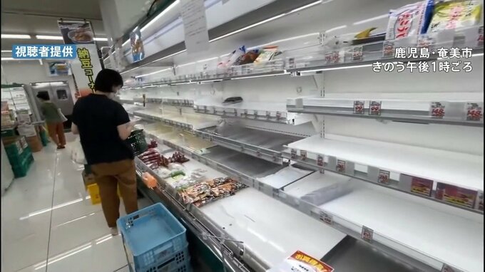 7日午後1時ごろに撮られた奄美大島にあるスーパーの映像によると、食品の棚が空になっているのが分かります。