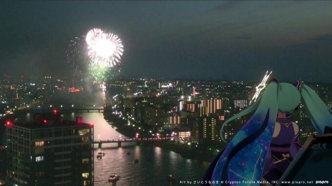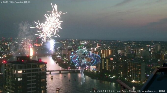 拡張現実「AR」の技術を使い、専用のアプリを通して花火を見ると、初音ミクと花火を見ている雰囲気が味わえたり、人気楽曲「千本桜」にあわせて初音ミクが踊ったりする様子を見ることができました。